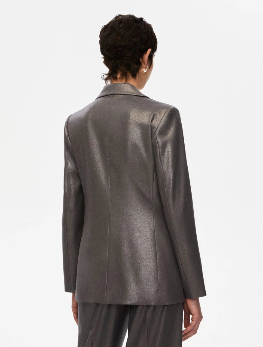 A sophisticated glow that's perfect post-sunset. Blazer in stretch lamé fabric.